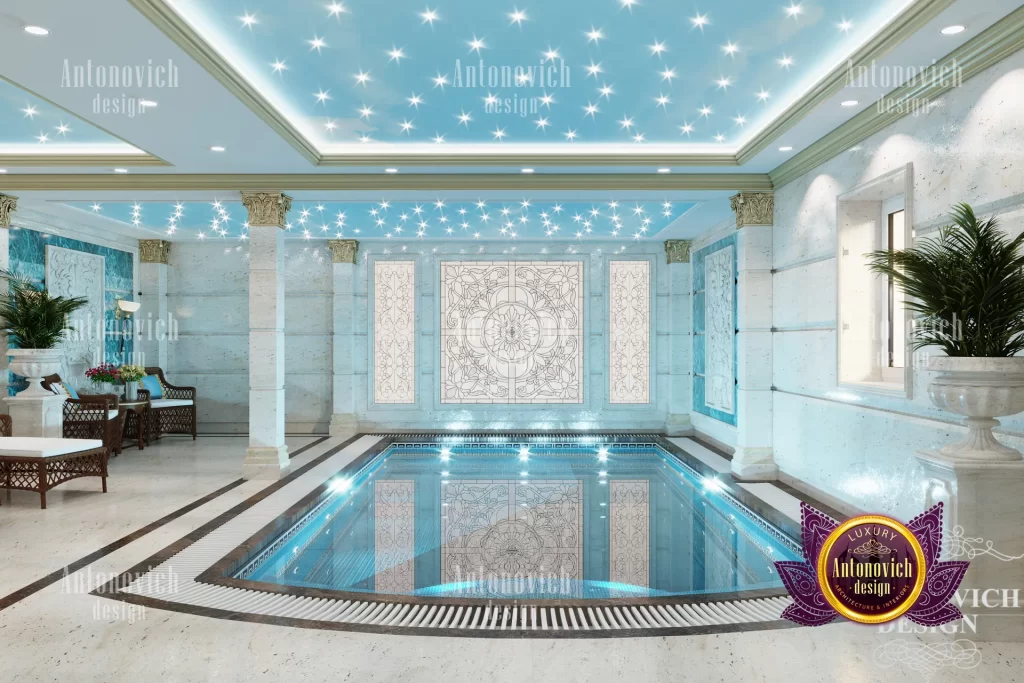 The blue luxury Classic Interior Design Swimming Pool has an extraordinary interior design that is out of this world. This warm and inviting pool decoration captures the allure of sophistication and elegance well. Luxury Design is able to lend a hand to clients in the process of designing the perfect luxury swimming pool interior for them, complete with the appropriate fixtures and a well-planned layout. This lavish home design is breathtaking in every conceivable way. The creation of the ceiling light is another step taken to ensure that your luxury swimming pool interior design achieves the desired one-of-a-kind appearance. The overall interior architecture of the swimming pool is eccentric yet inviting, which makes for a pleasant swimming experience.