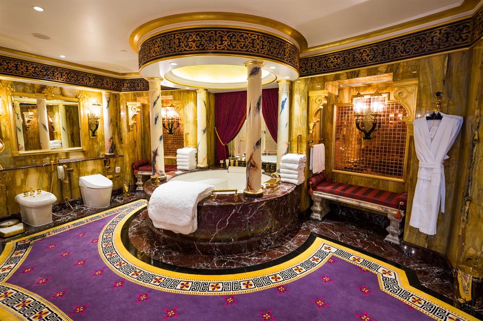 While few can afford an entirely gold bathroom, elements of this design can still inspire your next remodel. Use gold fixtures, mosaics, and mirrored lighting to evoke a sense of royal elegance—even on a smaller budget.